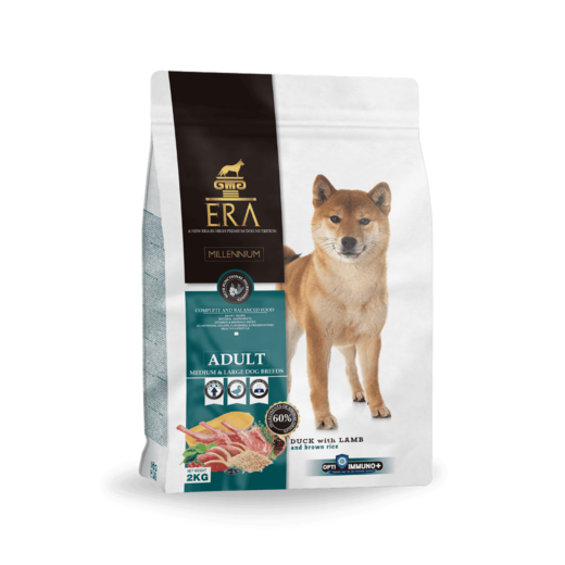 ERA Millennium Duck and Lamb Medium / Large on runsaasti herkullista ankkaa ja lammasta sisältävä täysravinto yli 10 Kg painaville aikuisille koirille.