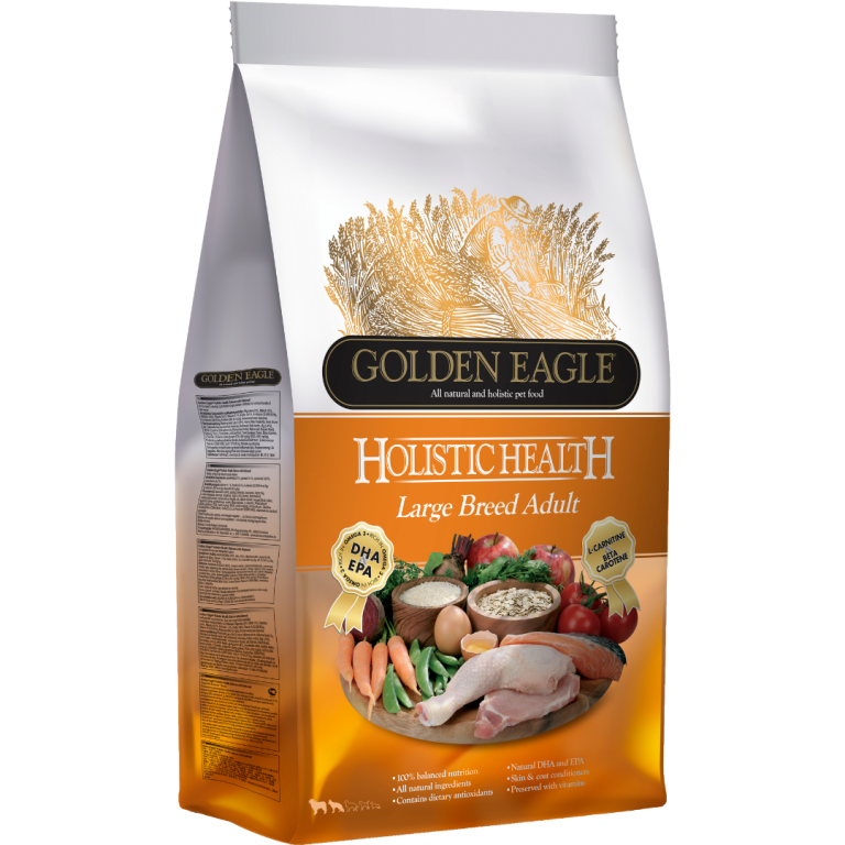 Golden Eagle Holistic Large Breed Adult on luonnollinen, holistinen ja vehnätön koiranruoka suuri- ja jättiläisrotuisille aikuisille koirille. Tasapainoinen koiran kuivaruoka, joka sisältää valikoituja, korkealaatuisia proteiinien- ja hiilihydraattien lähteitä sekä terveellisiä kasviksia ja hedelmiä ilman kemiallisia säilöntä-, maku- tai väriaineita.